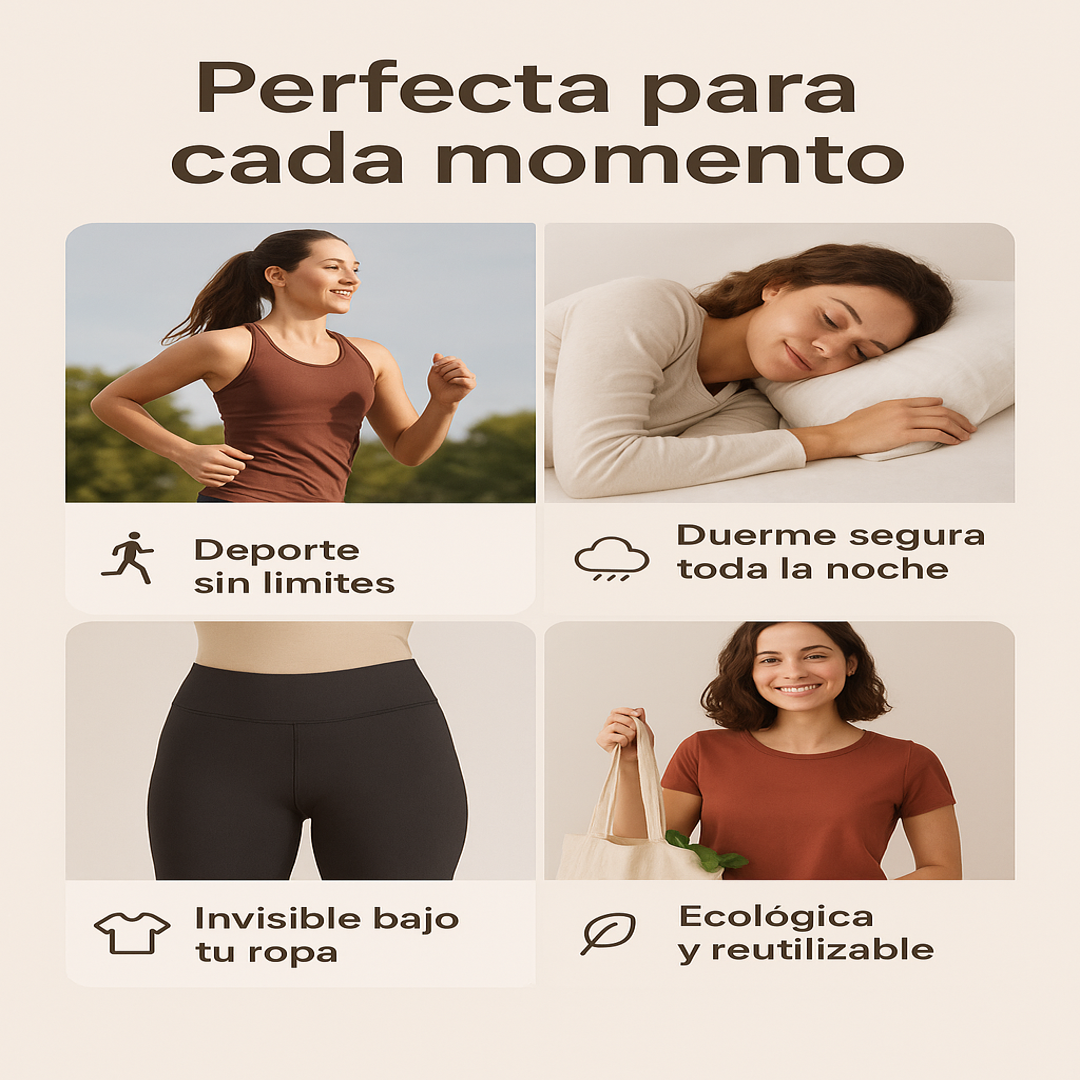 Haz deporte sin preocuparte, duerme segura toda la noche y úsala cada día como tu ropa interior habitual. Invisible bajo cualquier outfit y ecológica al ser reutilizable. Libertad, comodidad y confianza en cada momento de tu ciclo.